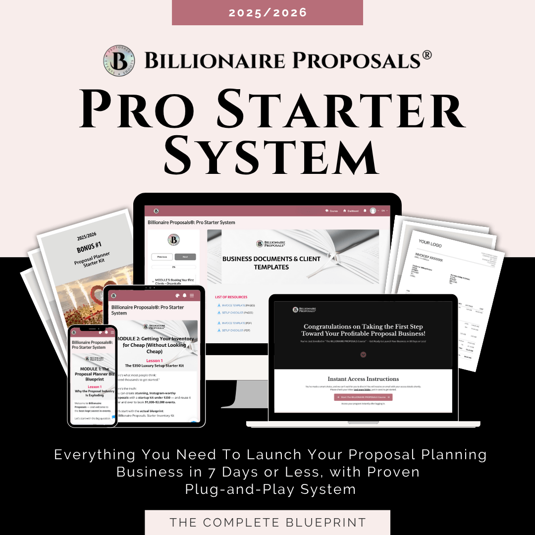 Listen, I built Billionaire Proposals® to help creatives and aspiring planners start earning $1,000–$3,000 per event, without spending years trying to figure it out like I did.